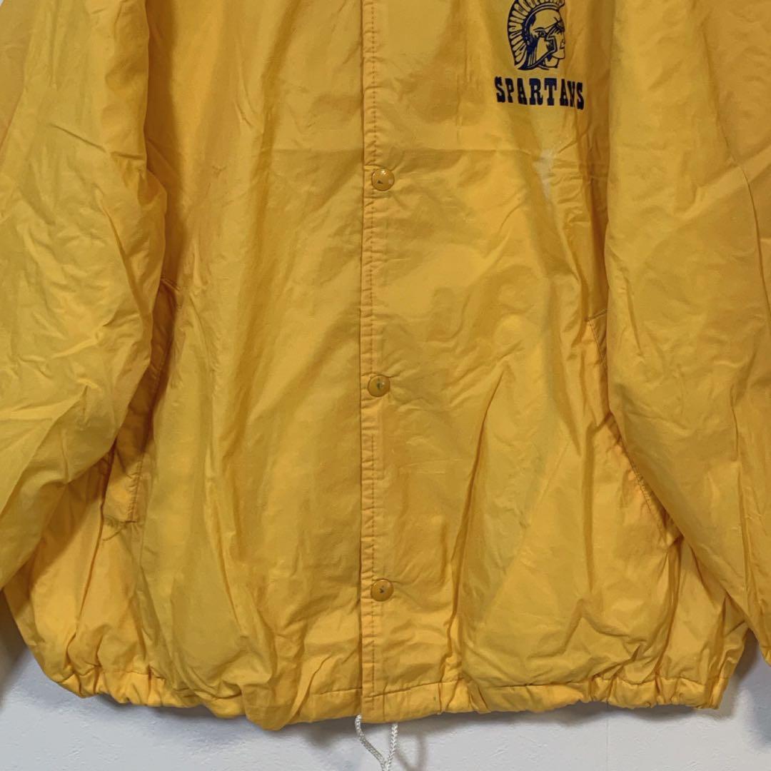 ナイロン製のイエロージャケット、スナップボタンとゴム裾付き、HOLY SPIRIT SPARTANSロゴ入り。