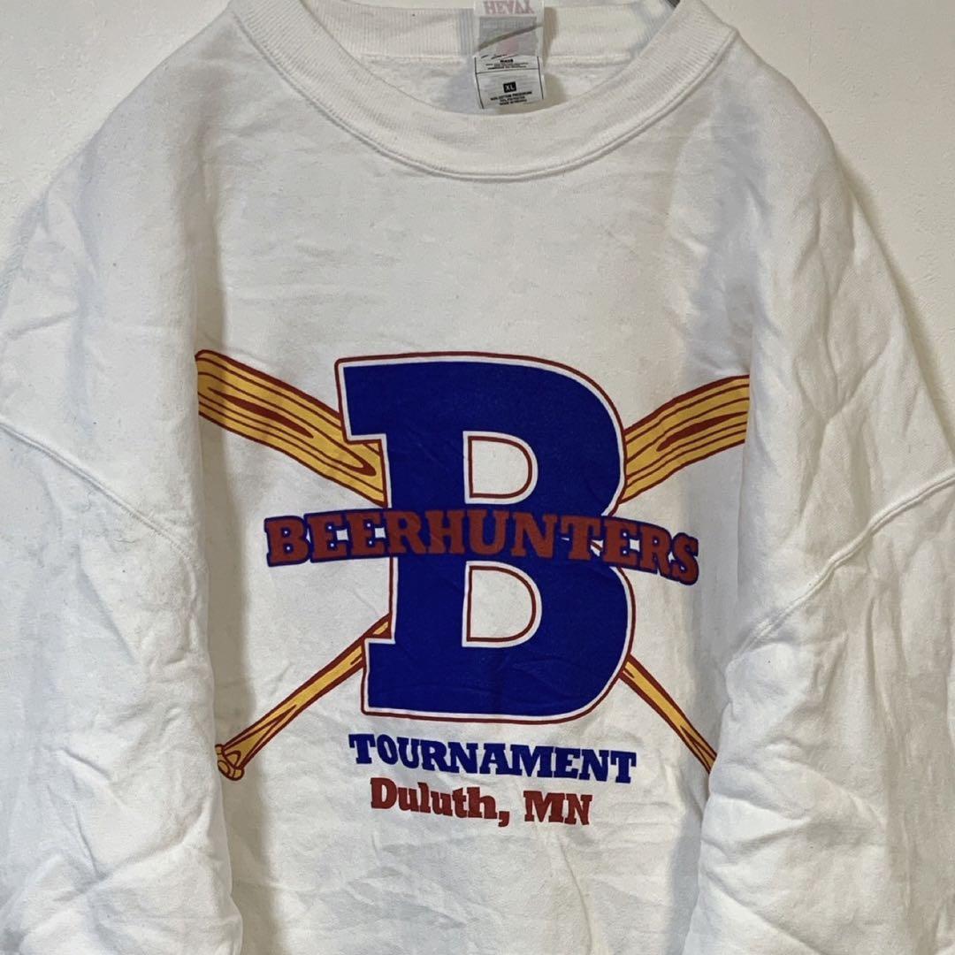 BEERHUNTERS Tournamentのグラフィックが特徴のホワイトクルーネックスウェット。