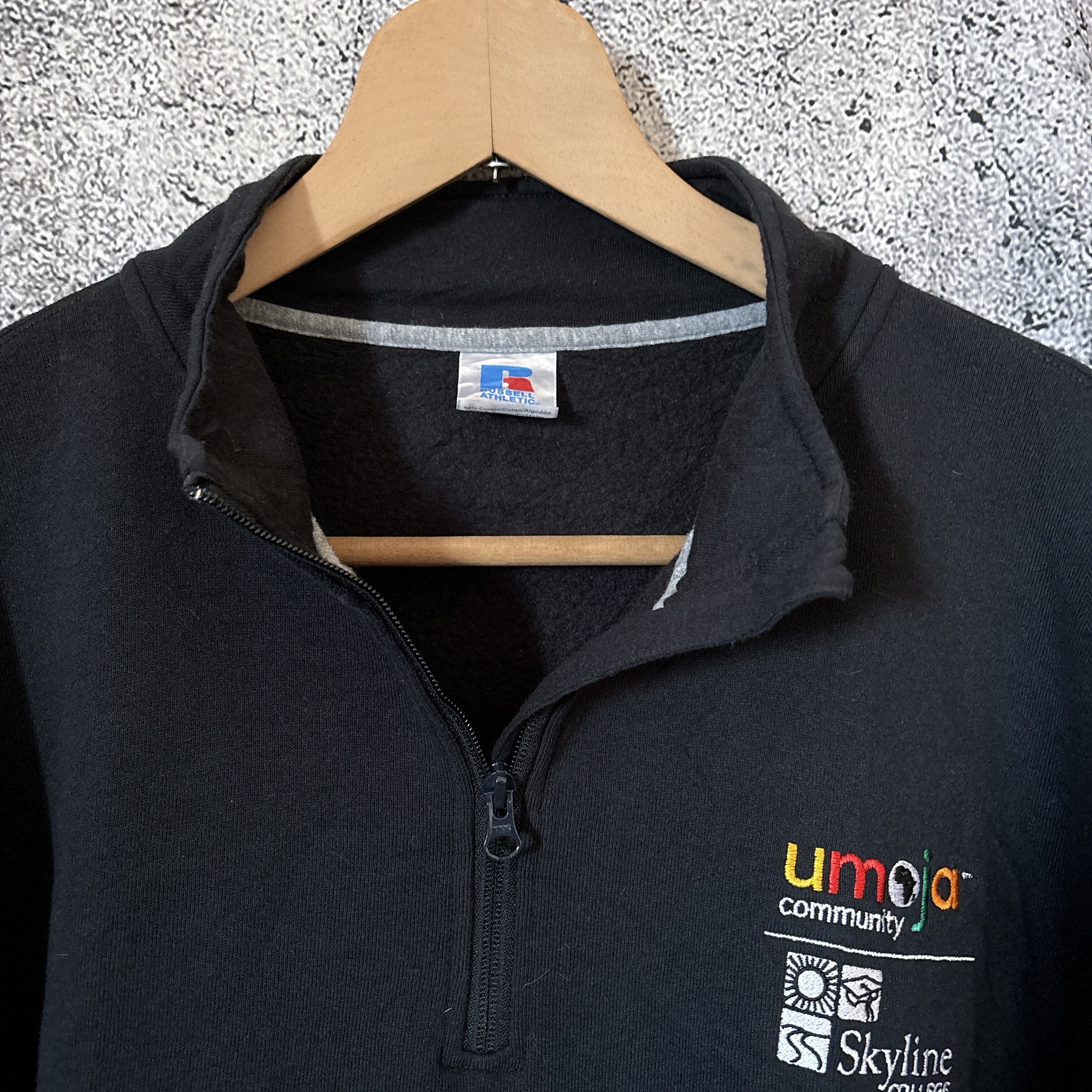胸にumoja community、Skyline Collegeの刺繍入りの人気カレッジデザインです。