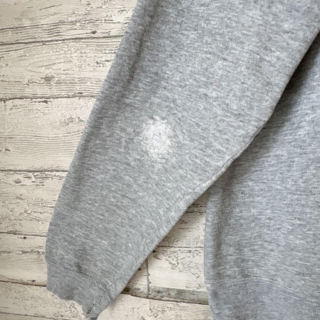 ボディはグレーカラー、コットン50% × ポリエステル50% の混紡素材で、80年代らしいしっかりした質感。ラグランスリーブ仕様で動きやすく、古着好きにはたまらない1着です。
