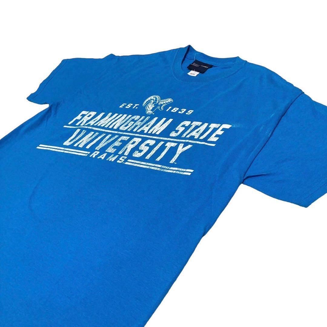 夏らしい鮮やかな青色の生地に、白色の英字のプリントが印象的なデザインです。