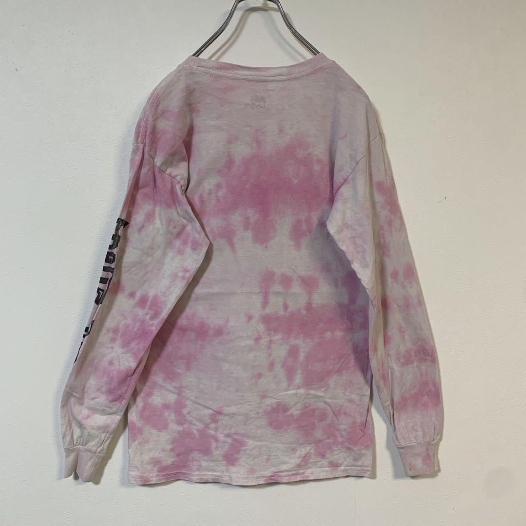 ピンクのタイダイ染めで、4つの顔のプリントが特徴的な長袖カットソー。